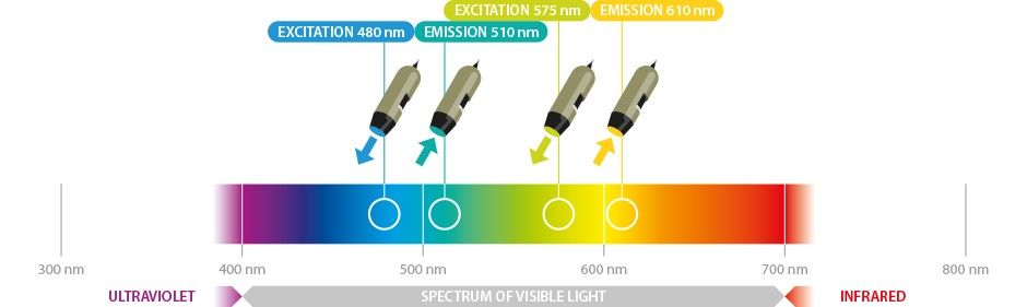 Dino-Lite AM4115T-GRFBY digitalt mikroskop är optimerat för forskning och visning av fluorescerande föremål med hjälp av 480nm och 575nm exciteringslysdioder. Den har ett 510nm och 610nm emissionsfilter som är utformat för att observera ett brett spektrum av fluoroforer med tillämpningar inom utvecklingsbiologi, patologi och anatomi.